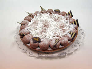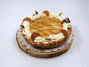Ein knuspriger Wiener Boden, gefüllt mit Karamell-Bayerischer Creme und Stroopwafelstücken. Garniert mit Schlagsahne, Karamellglasur und kleinen Stroopwafel-Keksen. Köstlich!